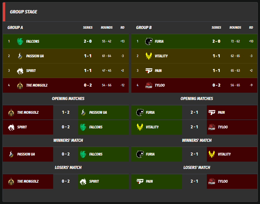 Fase de grupos: FURIA dominó en el grupo B, ocupando el primer lugar con un marcador limpio de 2-0, superando a rivales formidables como Vitality y paiN Gaming.