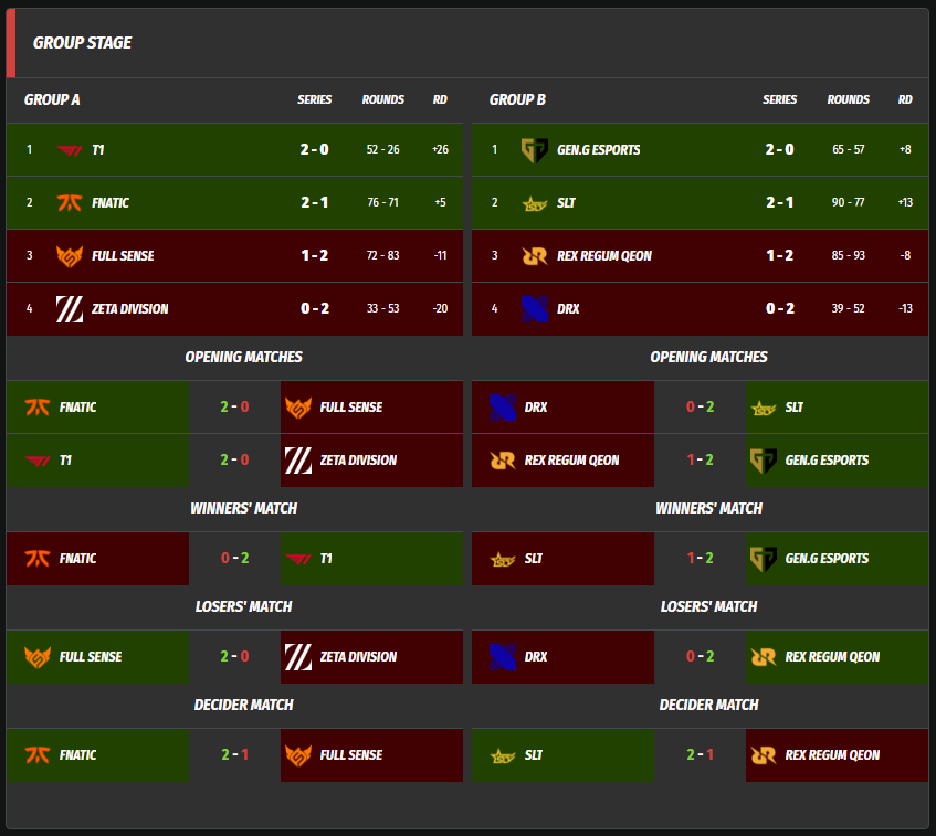 Fase de grupos: T1 dominó en el grupo A, asegurando el primer lugar con un marcador limpio de 2-0, superando a sus principales rivales en el grupo — Fnatic, FULL SENSE y ZETA DIVISION.